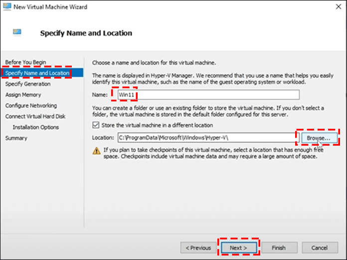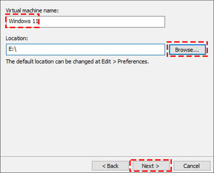 步骤3:在开始新的虚拟机之前,您需要完成新的虚拟机向导。首先,指定新虚拟机的名称和位置。之后,单击“下一个”。