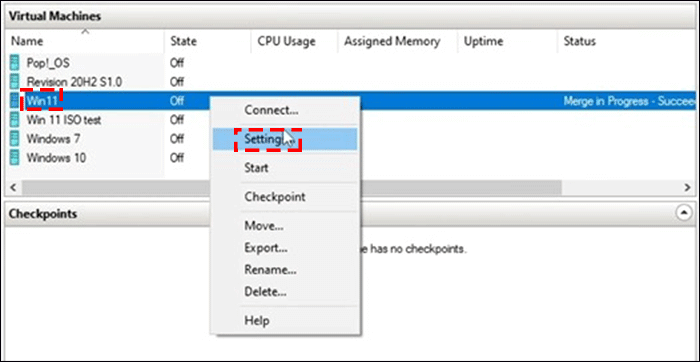 步骤10:将鼠标悬停在您创建的虚拟机上并右键单击“设置”。