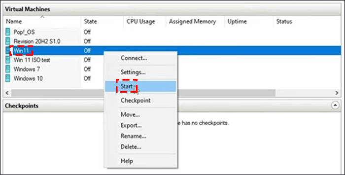 步骤12:将鼠标悬停在虚拟机上,然后右键单击“开始”开始运行。