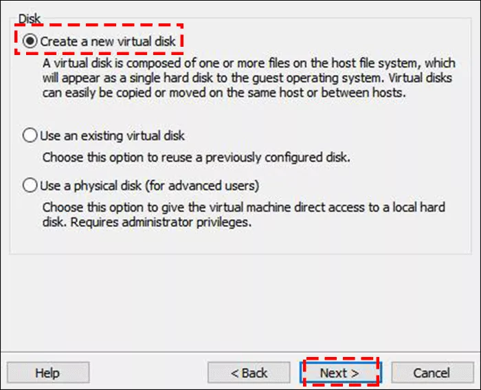 步骤13: 选择 ”创建一个新的虚拟磁盘“要使用然后单击”下一个”。