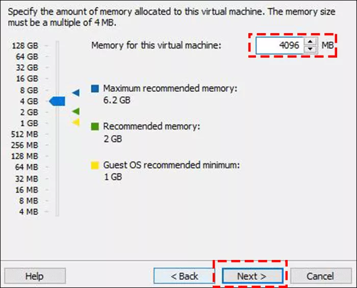 步骤5:指定分配给该虚拟机的内存量,然后单击“下一个”。