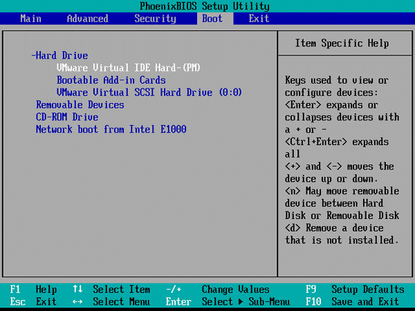 第8步:打开机器电源,然后按F2进入 BIOS 设置。前往开机选项卡,使用“+” 键从键盘上使硬盘进入第一个启动驱动器。
