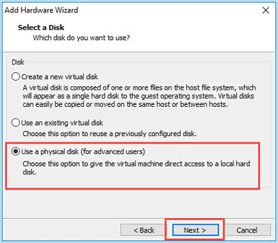 第 5 步:选择使用物理磁盘选项,那么下一个。