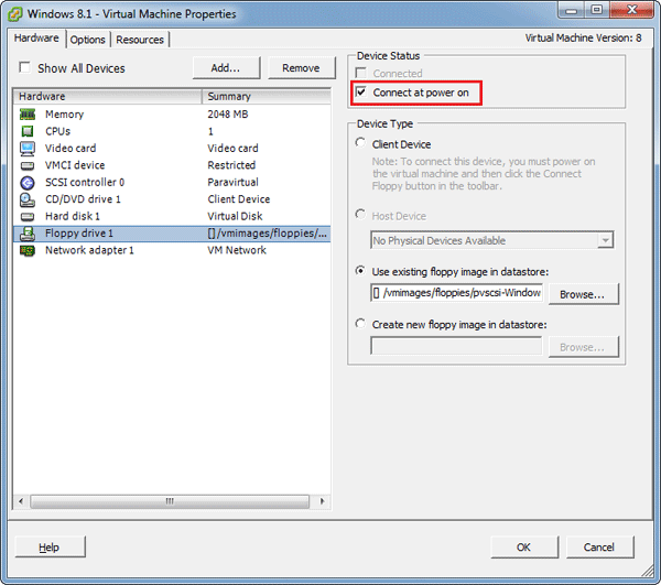 由于Windows 8.1和Windows Server 2012不直接在安装介质上提供VMware PVSCSI驱动程序,因此我们需要将PVSCSI驱动程序挂载到软盘驱动器。请按照下列步骤操作:
