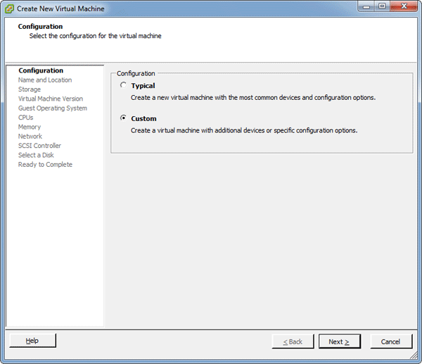 - 这将启动创建新虚拟机向导,如下所示。选择风俗对于我们需要指定的配置VMware 准虚拟化稍后作为该虚拟机的 SCSI 控制器。