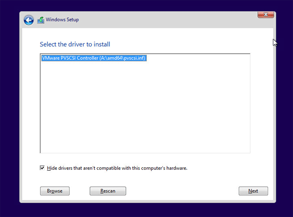 - 此时您将看到检测到VMware PVSCSI控制器驱动程序,单击下一个加载驱动程序。