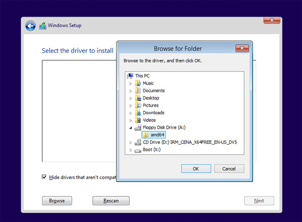 - 要加载 PVSCSI 驱动程序,请单击负载驱动器。浏览至软盘驱动器 (A:) > amd64,然后单击确定。