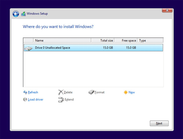 - 按照屏幕上的说明完成安装。然而,当您进入提示您选择安装 Windows 8.1 的分区的步骤时,您会注意到由于缺少 VMware Paravirtual 的本机驱动程序支持,因此无法找到任何硬盘。