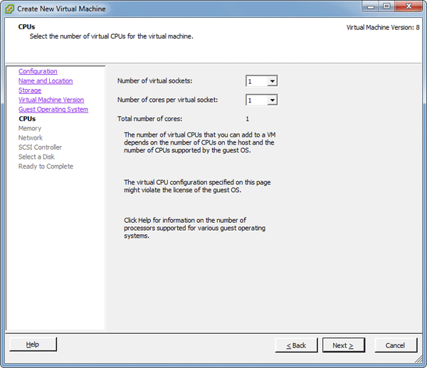 - 接下来,系统会提示您输入处理器的数量。这里设置的值是虚拟机认为它具有的值。您可以分配的最大数量等于您拥有的物理核心数量。