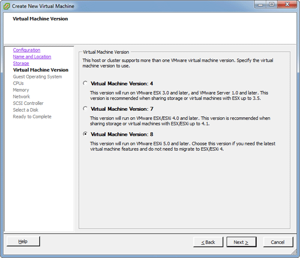 - 接下来 vSphere 客户端要求设置虚拟机的版本。仅当您将此计算机与旧版本的 VMware ESXi 一起使用时,才会出现此问题。我会选择最新版本8。