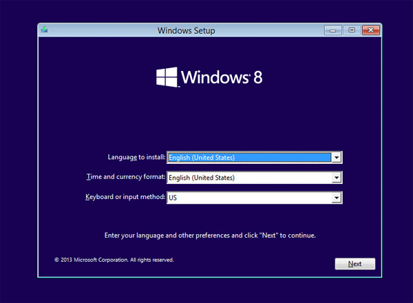 - VM 从 Windows 8.1 安装光盘或 ISO 映像启动后,您将看到消息“按任意键从 CD 启动”。按任意键,您将进入 Windows 设置屏幕。