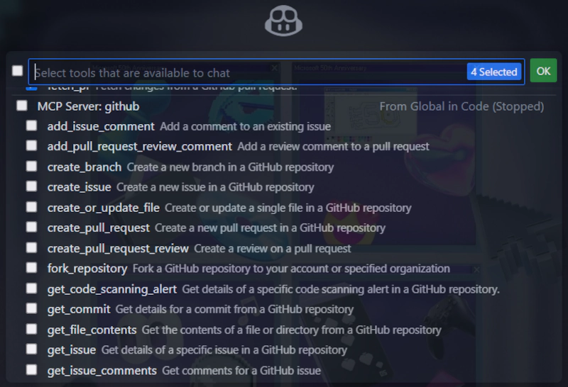 单击工具按钮并刷新工具列表。应出现已安装的 MCP 服务器(例如“GitHub MCP 服务器”)。如果需要,将其打开。