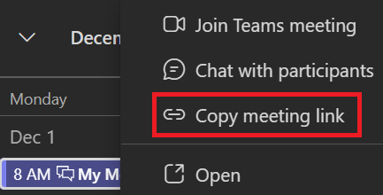 如果您已创建会议,则可以复制会议链接并与组织外部的人员共享。您还可以在活动会议期间添加用户。