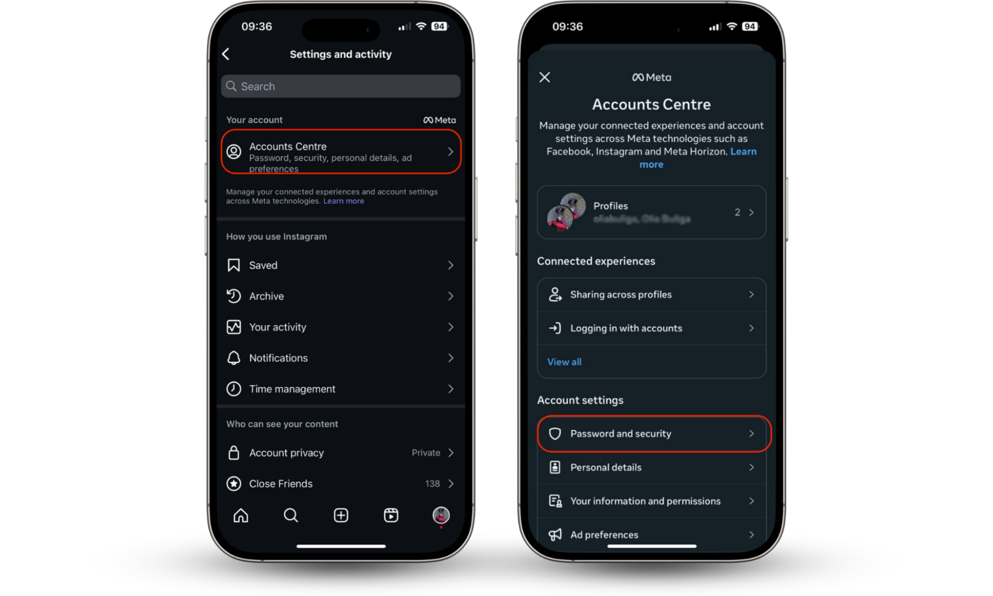 步骤 1-2。转到 Instagram 设置 > 单击帐户中心 > 密码和安全