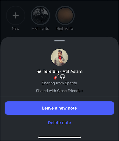 您的备注将显示在收件箱顶部以及个人资料选项卡中您的个人资料照片上方。您的关注者可以看到您当前在 Spotify 上收听的音乐。