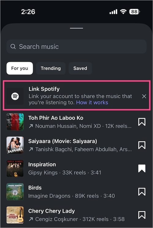 - 轻敲 '链接 Spotify' 将您的 Spotify 帐户链接到 Instagram。