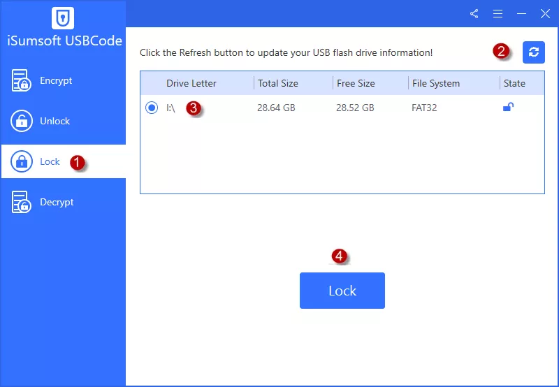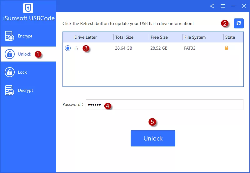 打开iSoft USBCode并选择加密选项。接下来,单击新鲜图标并选择已连接的 USB。然后输入USB加密的密码,点击加密按钮开始加密 USB。