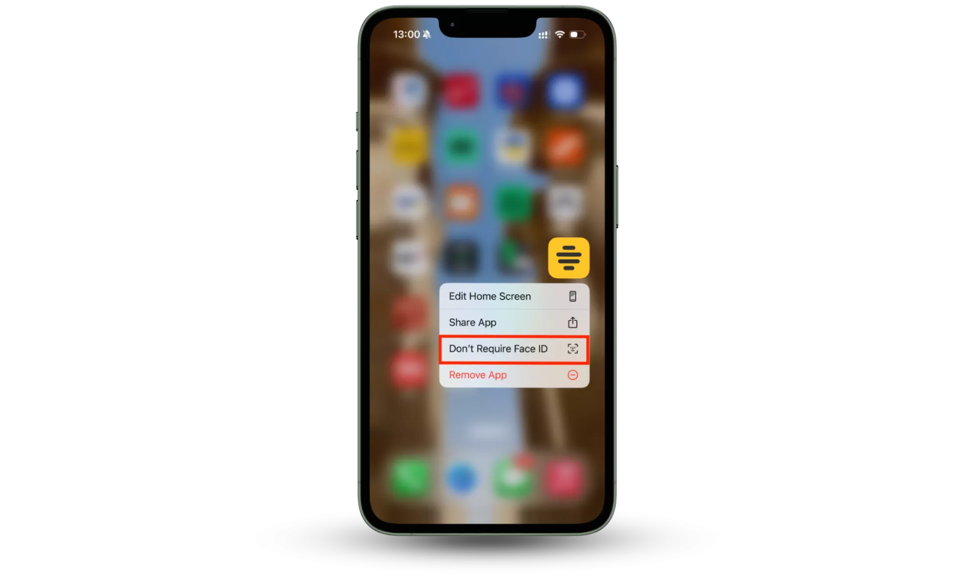 步骤1-3:找到应用程序图标,长压直至菜单出现,然后选择“需要面部ID”。