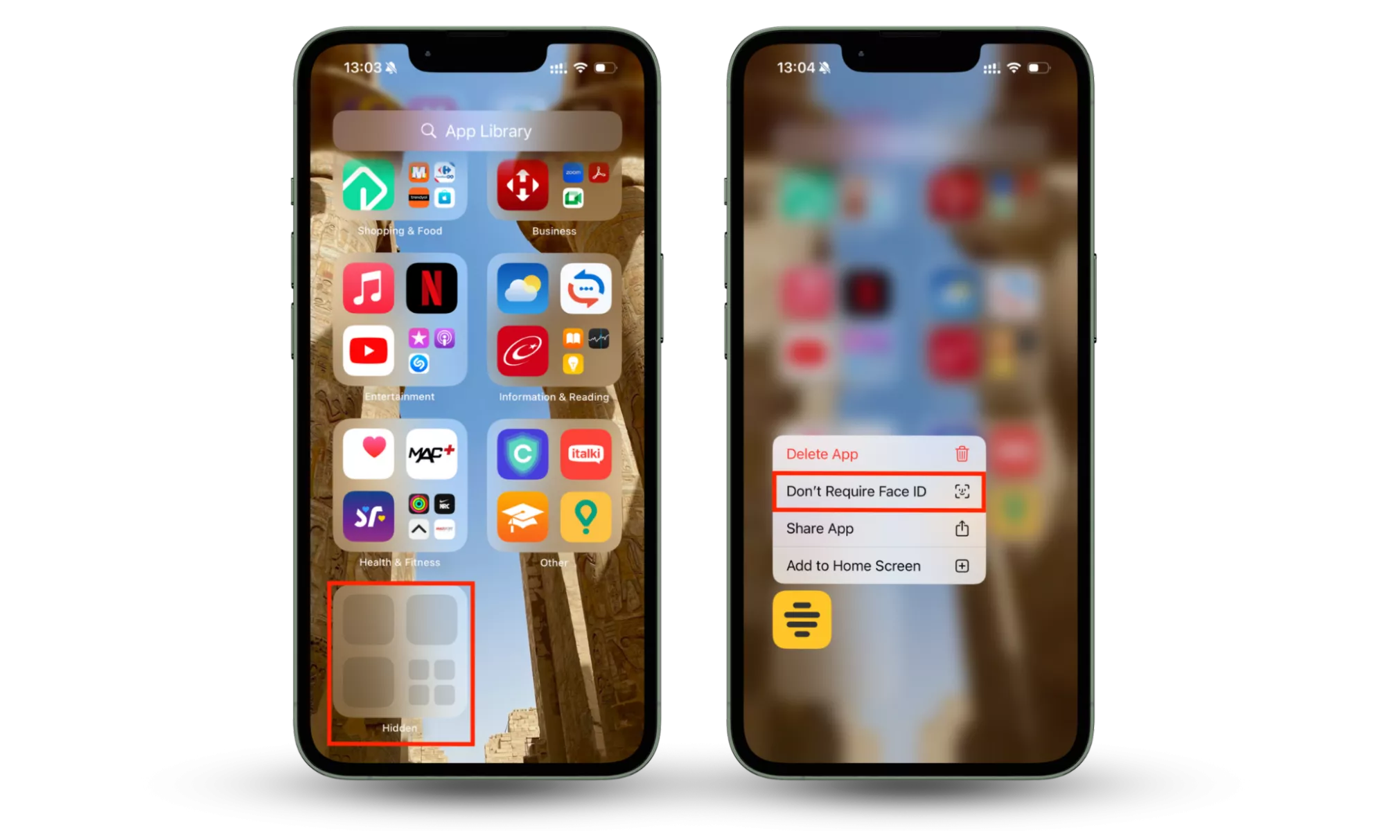 步骤1-2:找到要隐藏的应用程序>长按应用图标,直到菜单出现>按hide并需要face ID为止。