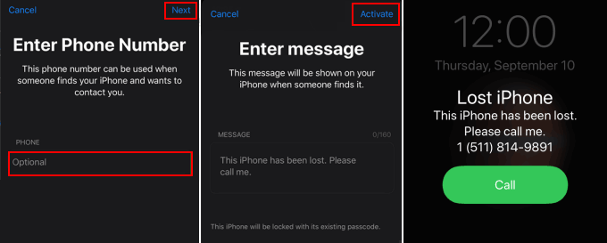 步骤 4:输入您想要在锁定屏幕上显示的消息 - 或接受默认消息。轻敲激活锁定您的 iPhone。这样您就可以使用密码远程锁定丢失的设备,并在有人找到它时显示一条包含联系信息的消息。