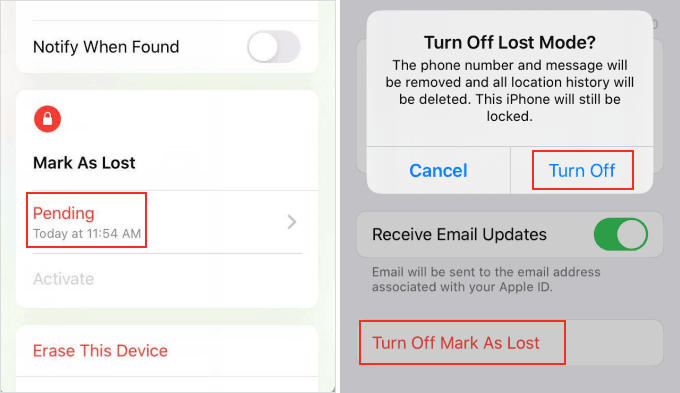 - 在“查找我的”中,点击设备,点击“标记为丢失”下的“待处理”或“已激活”,点击关闭“标记为丢失”,然后点击“关闭”。