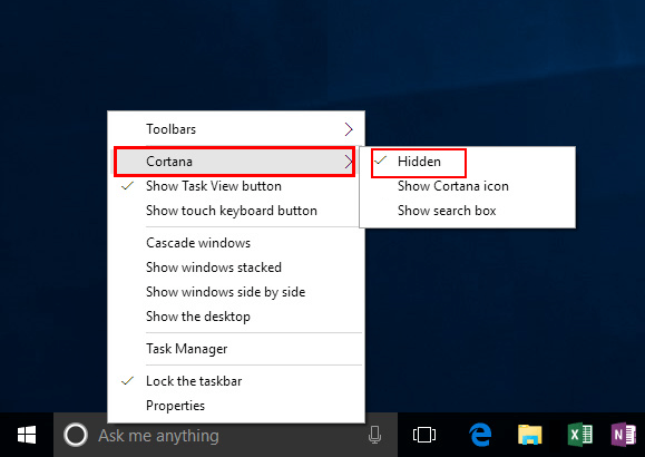 方式 1:在任务栏上下文菜单中隐藏任务栏上的搜索框或 Cortana 图标。