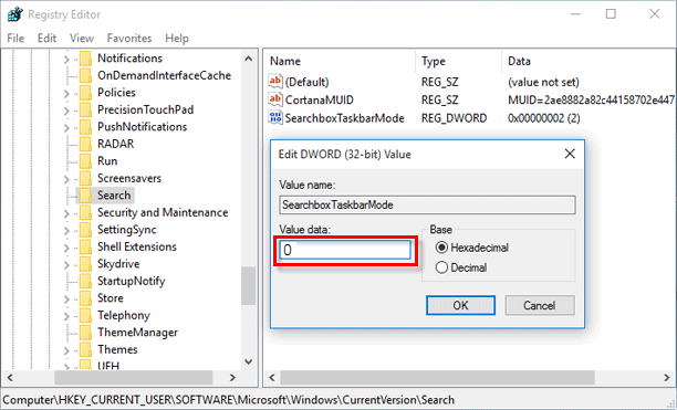 方法 2:在注册表编辑器中隐藏任务栏上的搜索框或 Cortana 图标。