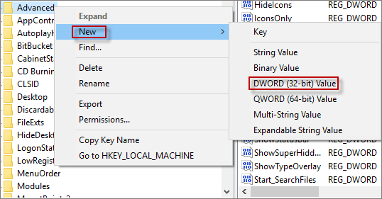 HKEY_CURRENT_USERSoftwareMicrosoftWindowsCurrentVersionExplorerAdvanced