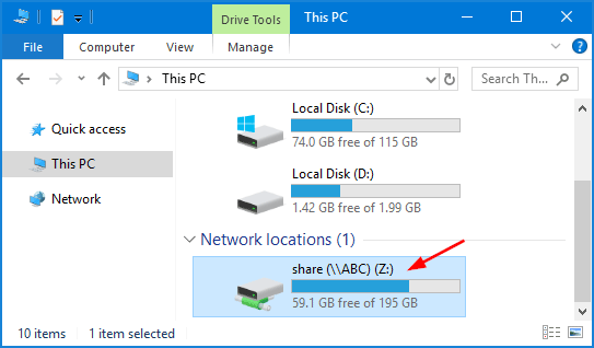 - 映射后,网络驱动器将显示在文件资源管理器中。您可以单击该驱动器来访问共享文件夹,就像它是本地驱动器一样。