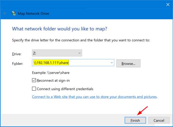 - 单击驱动器下拉菜单并选择要分配的驱动器盘符,然后输入要将驱动器映射到的共享文件夹的地址,然后单击结束。