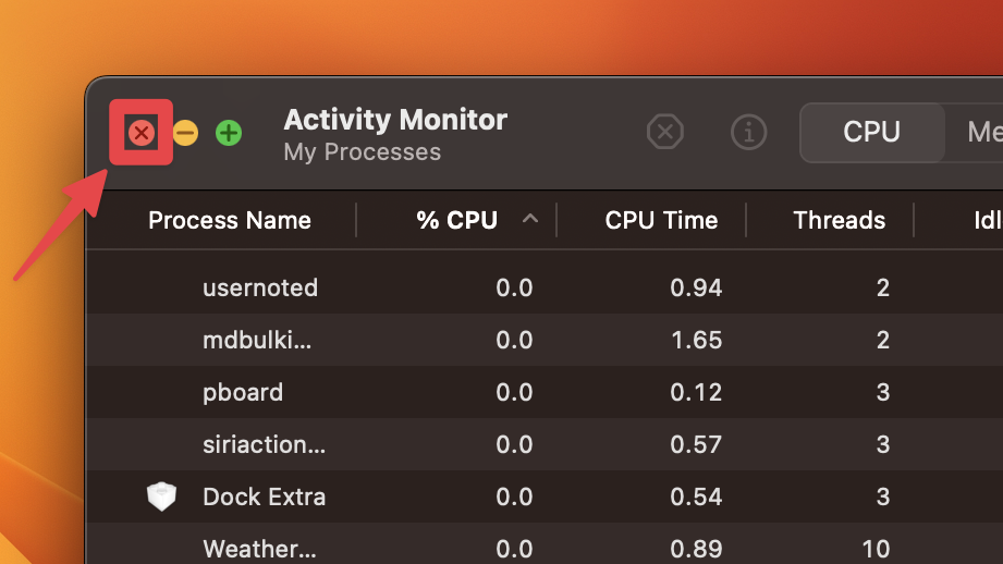 - 关闭活动监视器窗口,通过单击红十字图标在左上角。