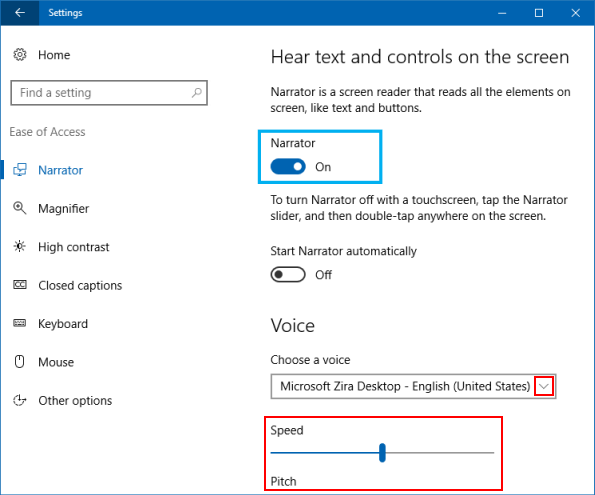您可以通过使用页面上的适当控制调整来更改旁白的声音、速度和音调。要禁用讲述人,只需单击旁白转变。