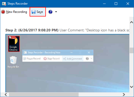步骤 5:查看您所执行的步骤的记录,以确保它显示您想要显示的内容。选择节省按钮,键入 .zip 文件的名称,选择保存位置,然后选择节省。