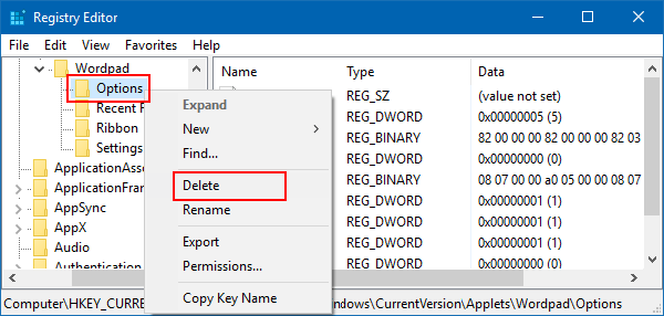 在右窗格注册表编辑,在WordPad下,删除选项钥匙。