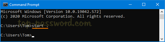 打开命令提示符窗口,键入以下命令并按 Enter。这将启动文件资源管理器并打开您在命令提示符下所在的当前文件夹位置。