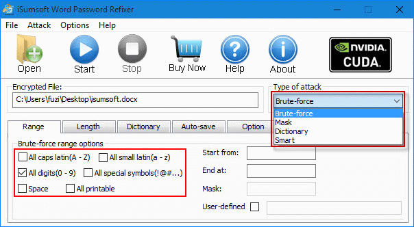 如果你对这个密码没有任何线索,请使用默认的攻击类型——暴力破解,它将尝试所有可能的组合键来有效地恢复您的Word密码。您可以设置密码范围和密码长度,以提高恢复效率。