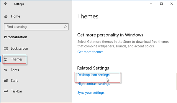 打开设置应用程序,然后转到个性化>主题。向下滚动到相关的设置位置,然后单击“桌面图标设置”链接。