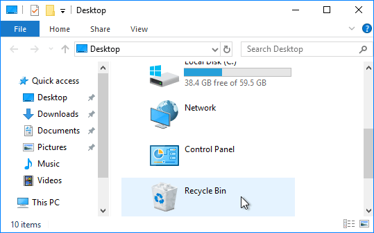 它将带您到文件资源管理器窗口中的桌面位置,您可以在其中看到回收箱。