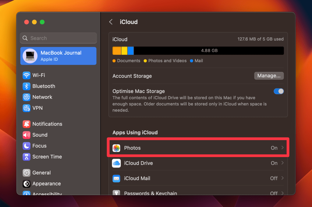 在照片应用程序中启用 iCloud 照片库。这会将您的整个照片库上传到 iCloud。启用后,您可以选择优化 Mac 存储。此选项可在 Mac 上保留较小、节省空间的照片版本,而全分辨率原件则存储在 iCloud 中。