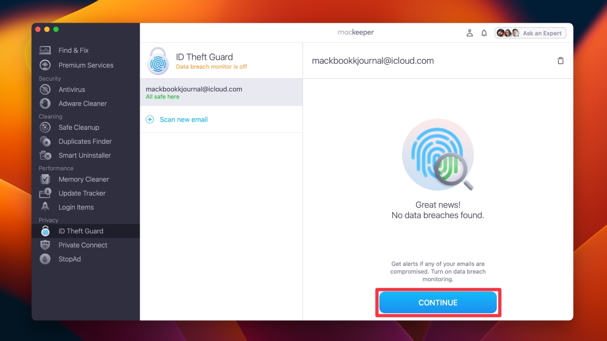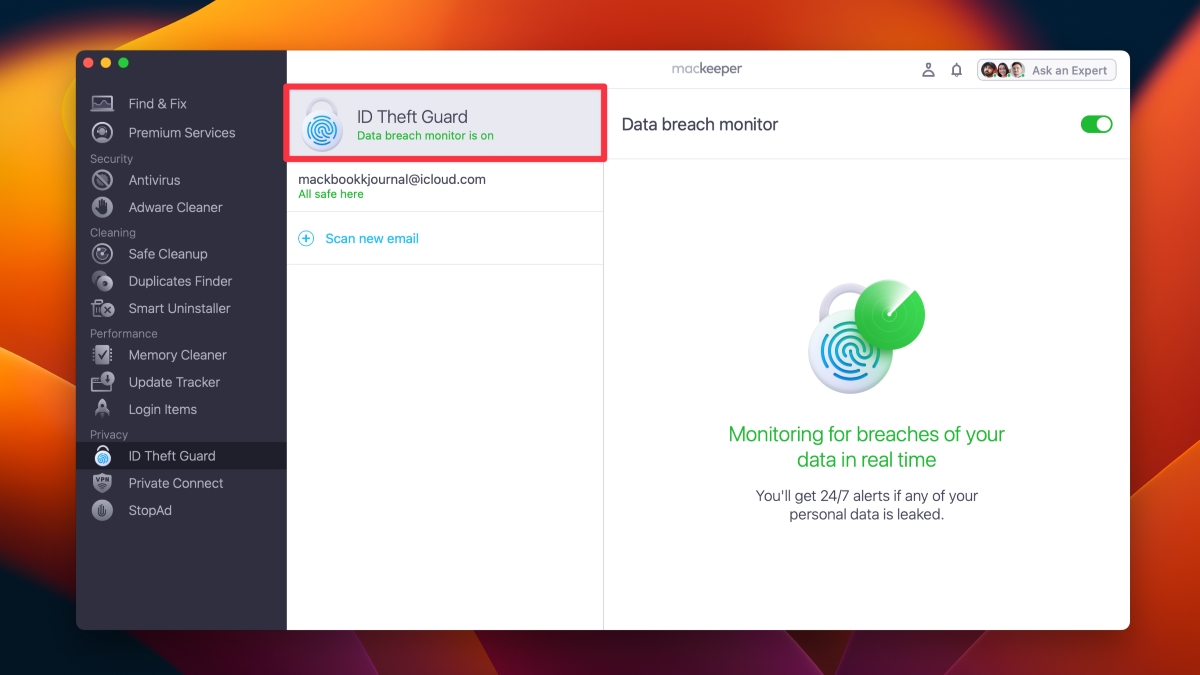- 你会看到数据泄露监控已开启窗口顶部的通知。它将在后台监控您的 Mac,并在发生数据泄露或泄漏时立即通知您,以重新保护一切并快速防止进一步的损坏。