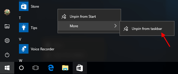 如果应用程序当前固定到任务栏,则单击更多的,然后单击从任务栏取消固定将其删除。