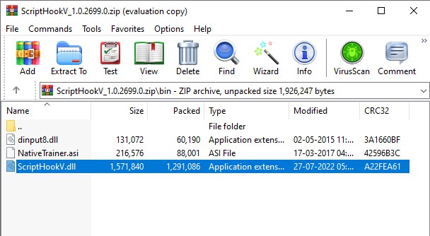 4. 打开 ScriptHookV zip 文件并解压ScriptHookV.dll文件复制到 GTA V 主游戏文件夹。