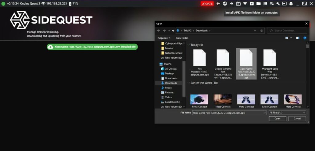 2. 使用 Sidequest 在 Quest 2 上旁加载 Microsoft Edge 应用程序 APK。