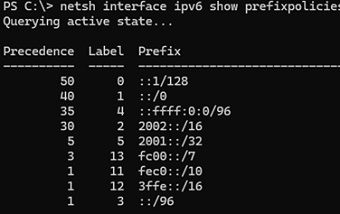 使用以下命令获取当前的 IPv6 前缀策略设置(决定不同类型地址的使用优先级):