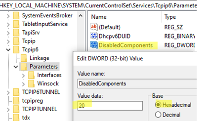reg add HKLMsystemcurrentcontrolsetservicestcpip6parameters /v DisabledComponents /t REG_DWORD /d 0x20