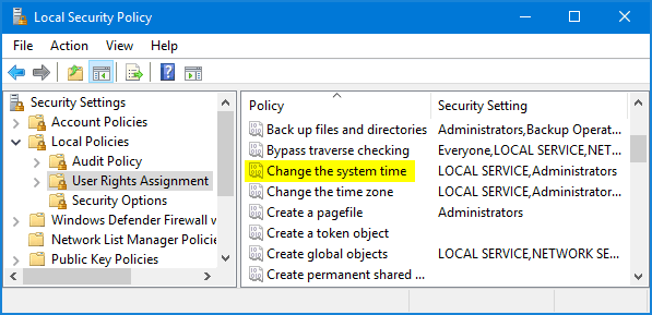 - 在左侧,向下钻取当地政策->用户权利分配。双击右侧的“更改系统时间”设置进行修改。