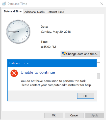 - 点击申请进而好的。重新启动计算机以使此策略生效。下次您尝试从控制面板更改日期和时间时,您将收到错误消息“无法继续。您无权执行此任务。”