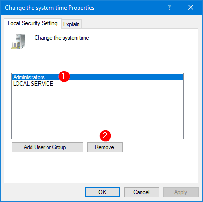 - 在“属性”窗口中,选择要阻止更改系统日期/时间的任何特定用户或组,然后单击消除。