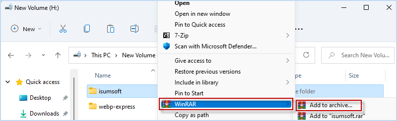 步骤1:右键单击外部或USB驱动器中的文件夹,选择WinRAR > 添加到压缩文件。