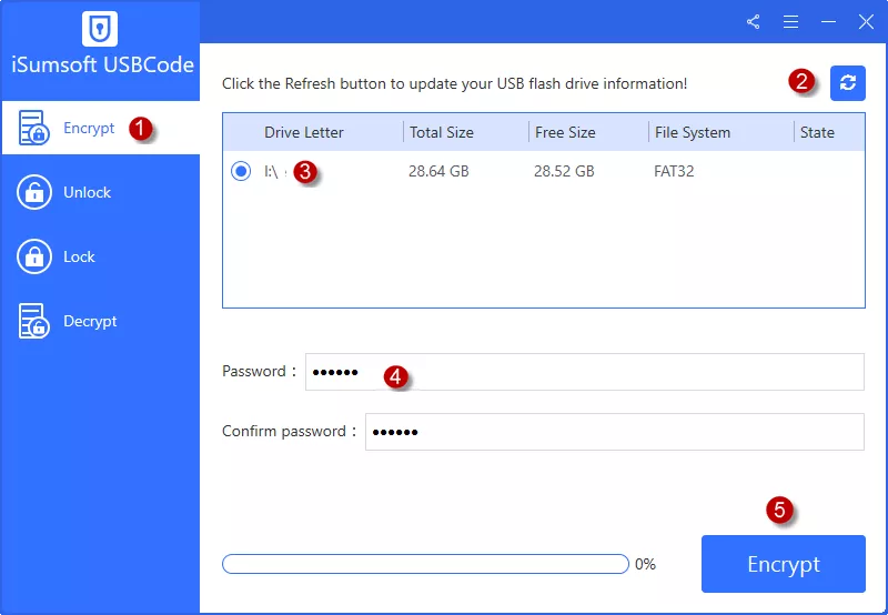 第二步:输入两次密码,然后点击加密按钮开始加密您的外部硬盘驱动器/USB 闪存驱动器。